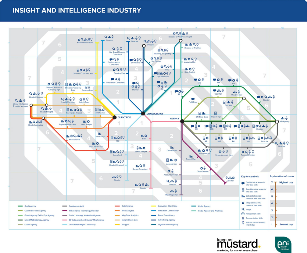 The routes show the career paths within insight and some of the most common job titles. The zones reflect the salary bands those roles fall into, and the symbols reflect some of the most commonly sought skills.
